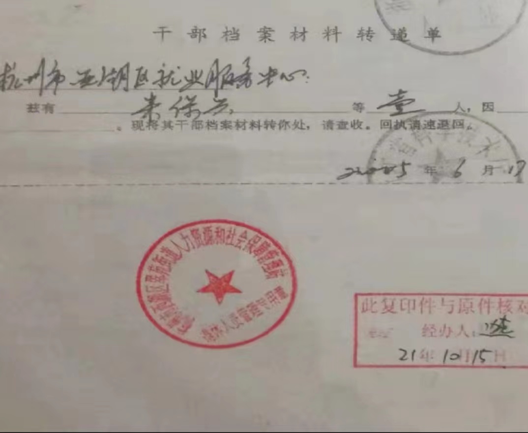 技厅人事处档案室不同意为我直接收集及开工龄证据给我是违反“档案法”和《中华人民共和国档案法实施办法》1999年06月07日第二十一条《档案法》所称档案的利用,是指对档案的阅览、复制和摘录。中华人民共和国公民和组织,持有介绍信或者工作证、身份证等合法证明,可以利用已开放的档案”。我是中华人民共和国公民,可以持有身份证等合法证明之一,利用已开放的档案,抄录档案中的工龄!当我要利用及抄录档案中的工龄的期间,浙江省科技厅人事处 却我的个人档案到西湖区保障服务中心是极大的违法欺诈行为,违背法律规定给我的工龄证据 的条例:公民可以“对档案的阅览、复制和摘录”!而对我的社会保险,退休性质,待遇及收入到了“釜底抽薪”作用,因当时我在庭审 期间中法庭正等待我的工龄及工作年限!2005-6-17关键时刻在我多次请求浙江省科技厅人事处直接摘录我从档案中的工龄利用,可是他们就是不同意我直接摘录工龄利用给我,同时,他们却转递我档案到西湖区服务中心去了 (见以下“干部档案材料转递单”证据),并且告诉西湖区服务中心不要为我从档案提供工龄证:(以下是作为一份新材料新证据。)