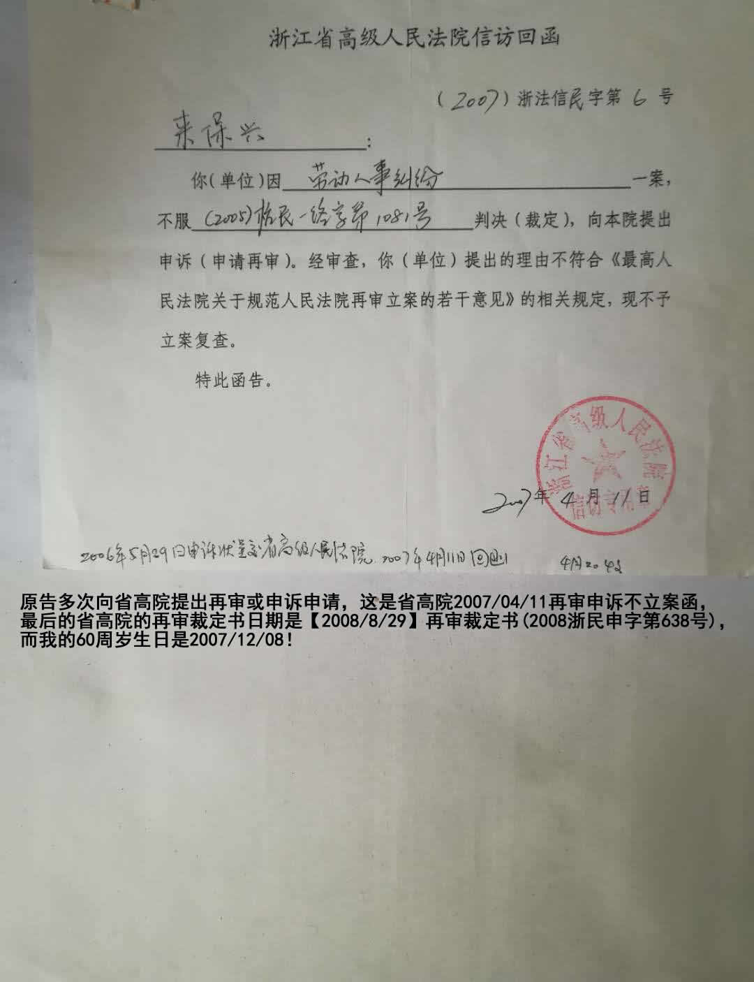 “你的信访材料到,已转省院民行处处理,今后你可直接与他们联系,此复.二00七年五月卅日浙江省人民检察院控告申诉专用章”: