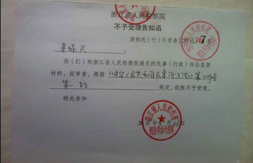 2016/3/23浙江省人民检察院不受理告之函:浙检民(行)不受告「2016」7号: