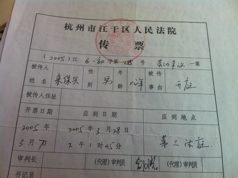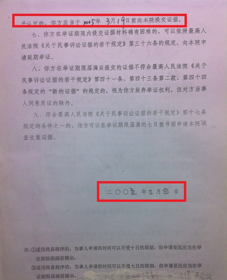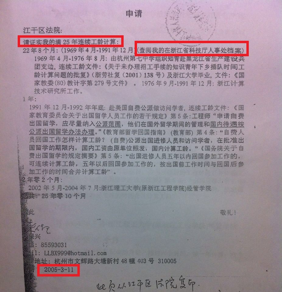 虽然工作年限是举证倒置,但一审时我还是递交了申请,要求法院查阅我档案(按我的满25年工龄)确定工龄年限,有两份从法院复印的证明如下(法院沒有去査阅):2005年3月4日的举证通知书要求我3月19日前提交证据,我在2005年3月11日提交了申请: