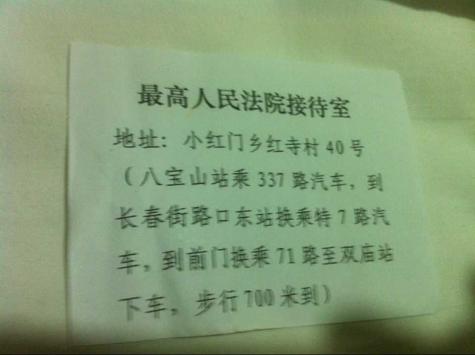 2015/10/15日去最高法,回答说去两地方解决:最高检和省高检.省高检我去过了知道其态度,第二天我去最高检前,从网上反复查到其地址是在东城区东交民巷27号,到那边才知其2015/6已经搬走,在其旁一家律师事务所门上布告上告诉去最高检的方向,是坐一号地铁到八宝山站向西找到严正街走300米即最高检信訪站,到那边后其接待厅窗口回答是给我如何去最高法接待站说明(没有抬头),我讲我昨天去过了,窗口里还是回答叫我去那边找最高法,这叫踢皮球,这是2015/10/16最高检信訪站给我的便条: