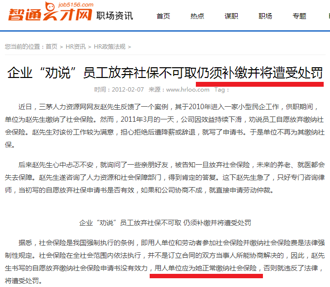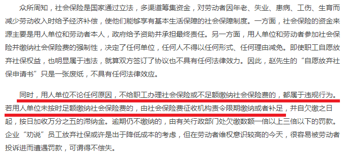 例15:题目:“企业‘劝说’员工放弃社保不可取仍须补繳并将遭受处罚”;