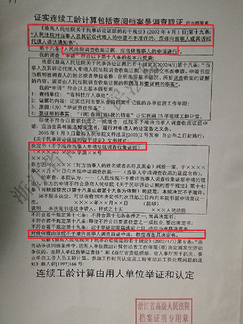 我在一审前2005/3/11日,二审前2005/6/17日呈交申请为了查阅我档案,要求法院调查收集证据,证实满25年连续工龄,如果法院不同意申请,依法应当送达我通知决定书,但法院没有送达我通知“决定书”,根据《最高人民法院关于民事诉讼证据的若干规定》(2002年4月1日)十九条,失去“向受理申请的人民法院书面申请复议”的机会!属于违法!对任何情形下法院不予准许为原告调查取证申请,按《规定》应当出具“决定书”,不然违反法定程序,影响公正判决 ! |