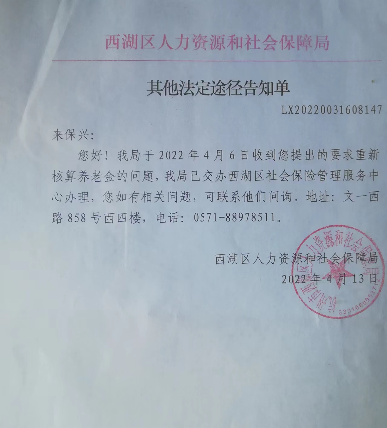 2022/4/13西湖区人力资源和社会保障局涵件: