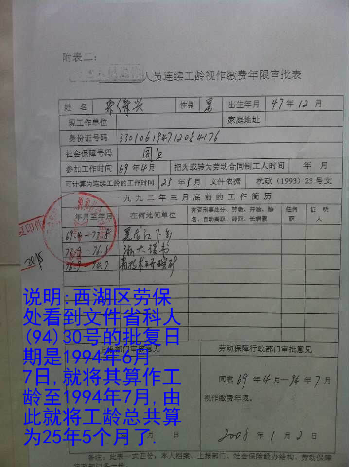 依停薪留职概念,工龄也至1994年5月,总共算成(1969/4-1994/5)25年2个月工龄是正确的.见附件a浙江省科委文件照片:最未一行发文日期是1994/6/7,杭州西湖区劳动保障部门是根据这日期将我的工龄定在1994/7,即1994年7月,(对我的工龄计算成25年5个月)见附件b.附件: