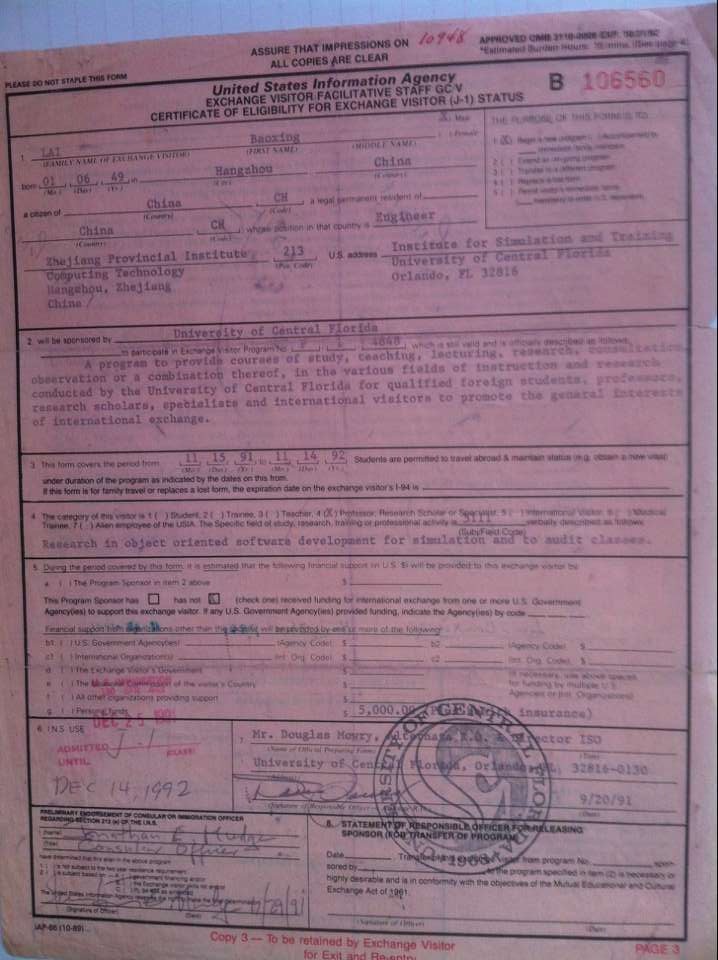 赴美用的访问学者I-66表:从该表可看出我赴美UCF模拟学院主修计算机图形,