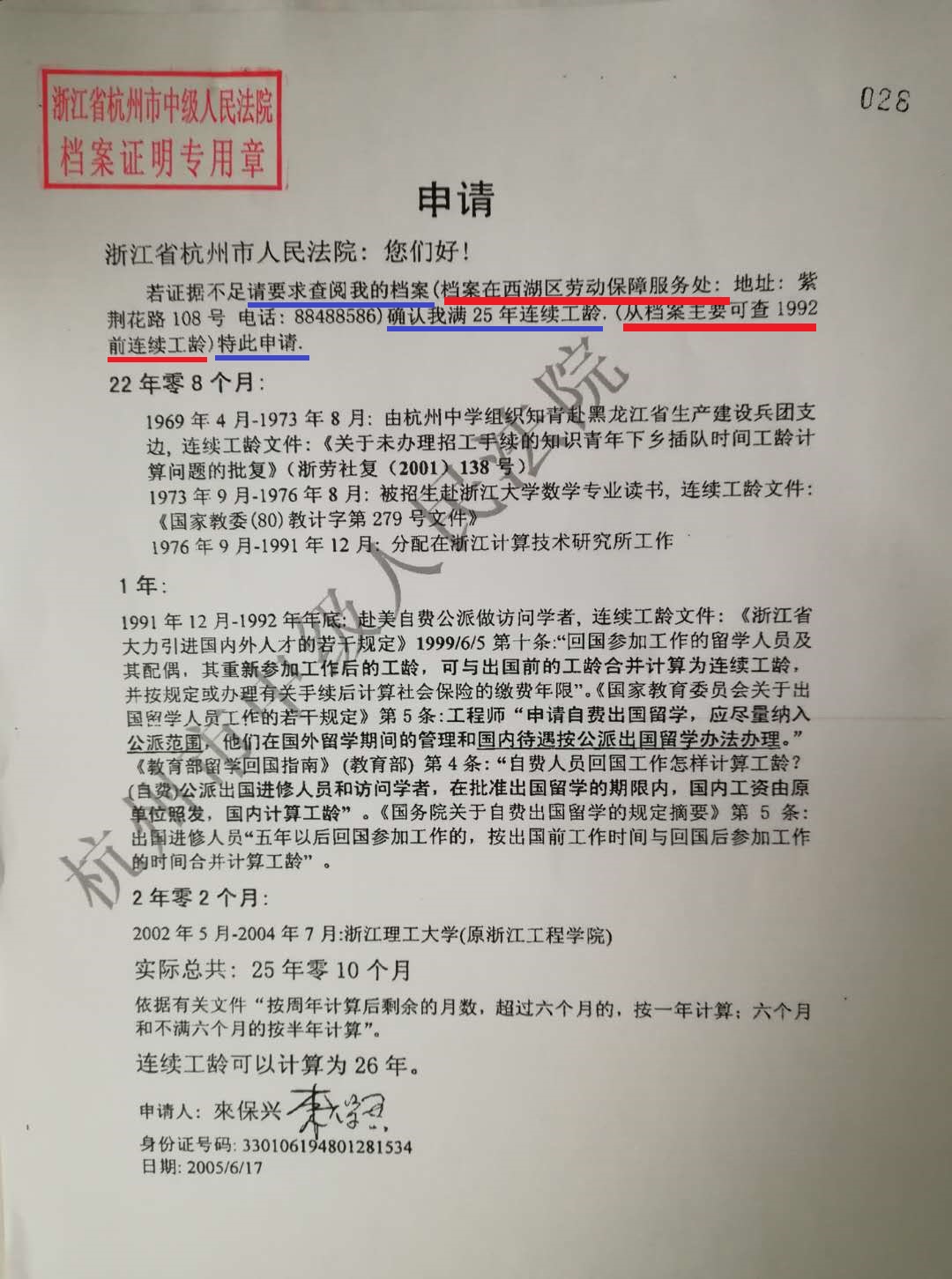 虽然工作年限是举证倒置,但一审时我还是递交了申请,要求法院查阅我档案(按我的满25年工龄)确定工龄年限,有两份从法院复印的证明如下(法院沒有去査阅):2005年3月4日的举证通知书要求我3月19日前提交证据,我在2005年3月11日提交了申请:
