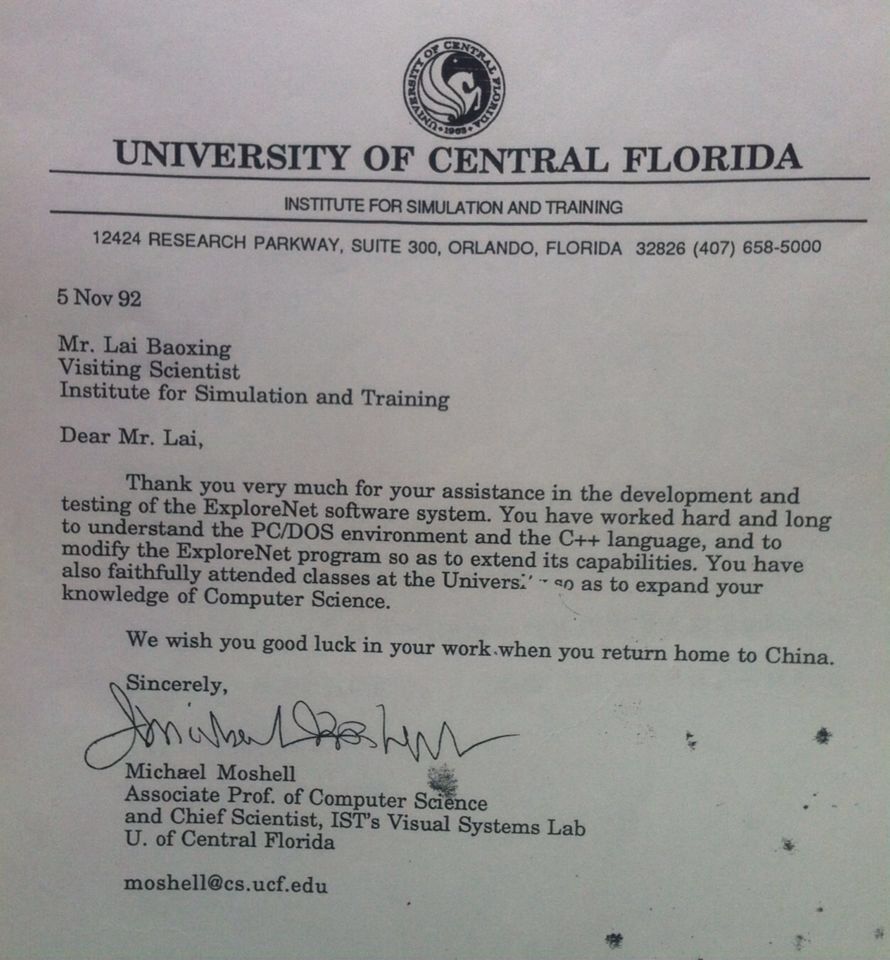 美国佛州中部大学(UCF)由Michael Moshell教授写的进修证明信及其译文: