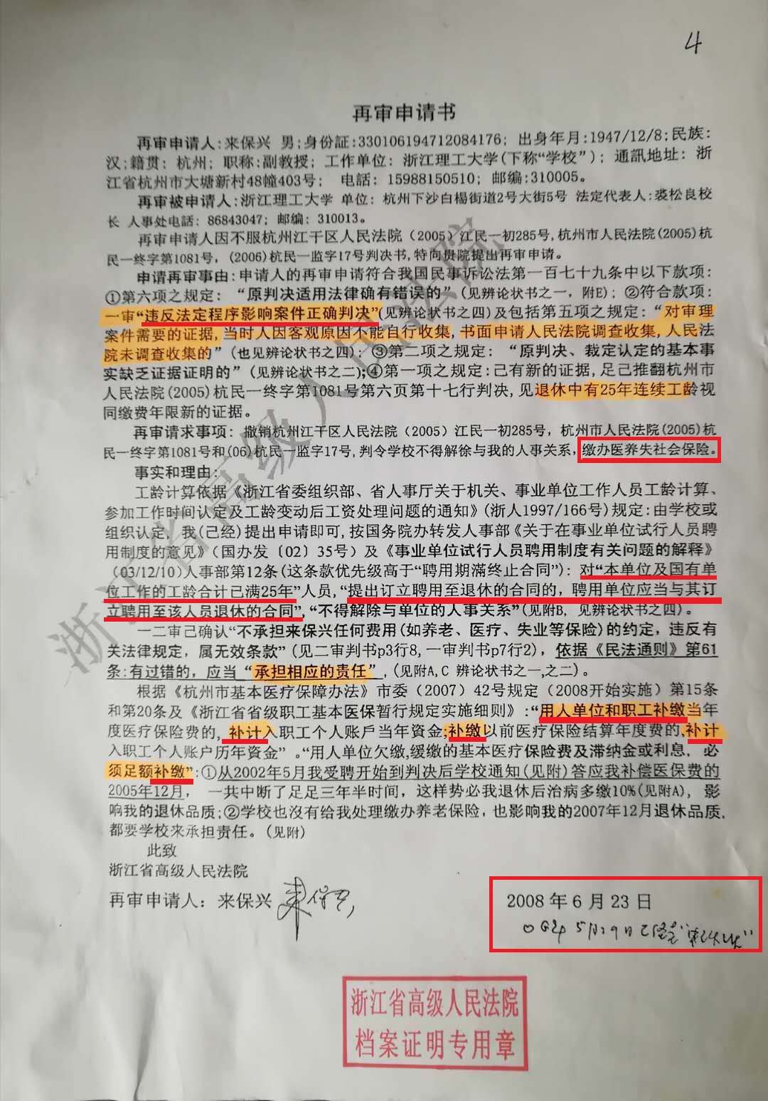 A:从以上编号3A&编号3B可知: 学校漠视法律和我的健康,在该“合同”中竟有“不承担保兴任何费用(如养老、医疗、失业等保险)”! B:一二审确认“不承担保兴任何费用(如养老、医疗、失业等保险)的约定,违反有关法律规定,属无效条款”(见一审判书[2005江民一初285号]第7页第2行,二审判书[(2005)杭民一终字1081号]第3页第8行); C:无效后的法律行为:①:责令改正,②:承担赔偿责任与③:一般可参照本单位同岗位的工资标准支付劳动报酬三个内容,但没有,而是以现金当作社会保险费支付给我,违反了法定的“代扣代缴”原则: 见“缴纳社会保险就要单位代扣代缴。”(双击左行划綫浏览相应内容); 见“案例”(双击左行划綫浏览相应内容); D:然后错误不断地上演,从2005年判决无效后,直至2020年还没有真正实现无效后的法律行为三步骤:改正,赔偿和参考同岗位的劳动报酬! |