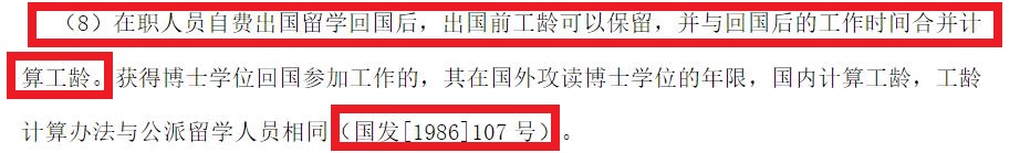 5、国务院国发[1984]185号文件《关于自费出国留学的暂行规定》中规定,在职职工自费到国外留学的,一般可停薪留职,本人要求退职的,可予同意。凡停薪 留职的,从出境的下一个月开始停发工资。出国进修人员五年以内回国参加工作的,可连续计算工龄,五年以后回国参加工作的,按出国工作时间与回国后参加工作的时间合并计算工龄。