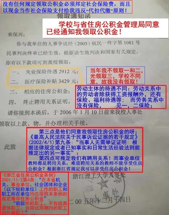 ,足足过了约共5年半(约2000天)后,还是没有为我办理正常的社会保险登记和执行“代扣代缴”的社会保险,还是没有纠正(改正)! 《浙江省劳动合同办法》2002/11/18省人民政府154号第39条: “用人单位有下列情形之一的,由劳动保障部门责令限期改正;给劳动者造成损失的,用人单位应当承担赔偿责任:(一)由于用人单位的原因致使劳动合同无效或者部分无效的”。2005年判决合同无效后,就是学校应当立马依法改正而为我办理社会保险登记和执行“代扣代缴”的社会保险,但没有(改正) !【编者按:若两个诉求在2005年一审能依法严格公正公平判决与执行,就不会有后面各种五花八门的无理头的伪命题了!】 2006年也没有纠正(改正)! 2007年也没有纠正(改正)! 从判决(用现金当医失保支付给我)过了约2年半多(约900天)后,至2007/12/8是我60岁生日,还是没有纠正(改正)! 从2002年5月学校工作开始至2007年12月8日是我60岁生日 ,足足过了约共5年半(2000天)后,还是没有为我办理社会保险登记和执行“代扣代缴”的社会保险!,还是没有纠正(改正)! 这是一种人性的冷漠!!! |
