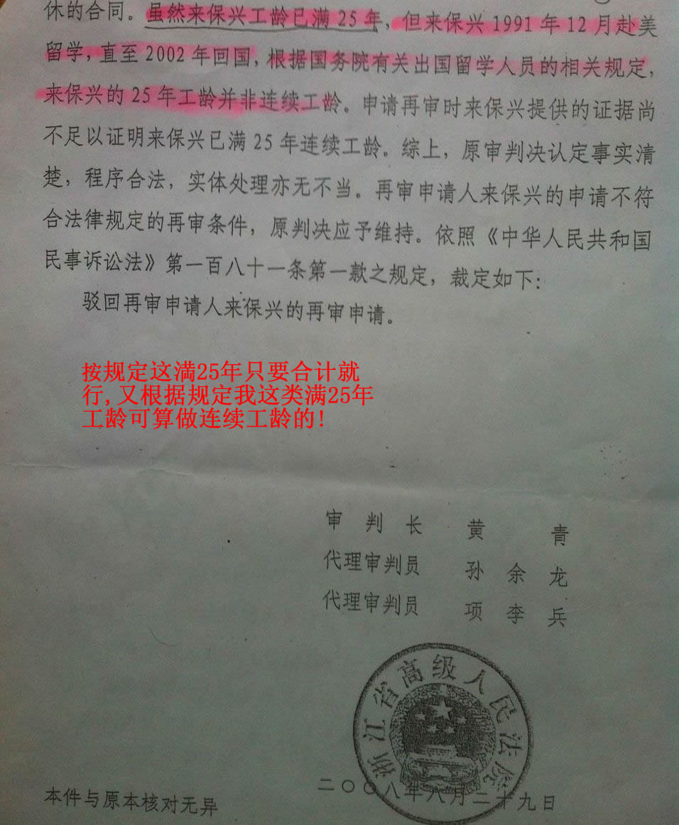 见“一二审已经证明有满25年连续工龄!”(双击左行划綫浏览相应内容);