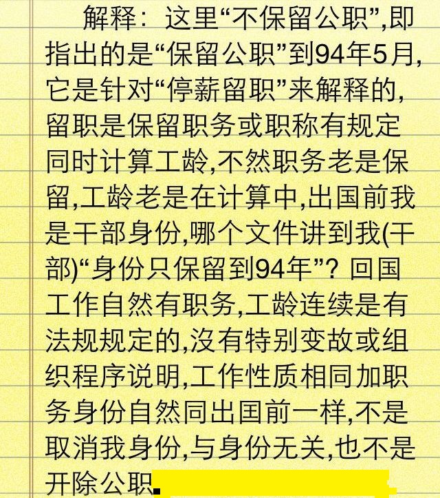 | 2:《关于出国留学人员工作的若干暂行规定》的通知(国发〔1986〕107号): 2、“(十)未经批准逾期不归的,一年内停薪留职,一年后是否保留公职,视不同情况由派出单位决定”。 | |